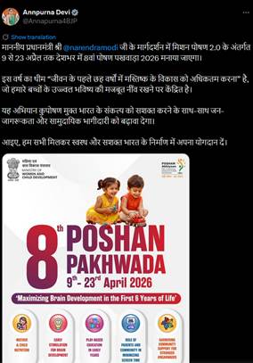 नई दिल्ली – श्रीमती अन्नपूर्णा देवी ने सोशल मीडिया प्लेटफ़ॉर्म ‘X’ पर कहा, “ माननीय प्रधानमंत्री श्री @narendramodi जी के मार्गदर्शन में मिशन पोषण 2.0 के अंतर्गत 9 से 23 अप्रैल तक देशभर में 8वां पोषण पखवाड़ा 2026 मनाया जाएगा। इस वर्ष का थीम “जीवन के पहले छह वर्षों में मस्तिष्क के विकास को अधिकतम करना” है, जो हमारे बच्चों के उज्ज्वल भविष्य की मजबूत नींव रखने पर केंद्रित है। यह अभियान कुपोषण मुक्त भारत के संकल्प को सशक्त करने के साथ-साथ जन-जागरूकता और सामुदायिक भागीदारी को बढ़ावा देगा।